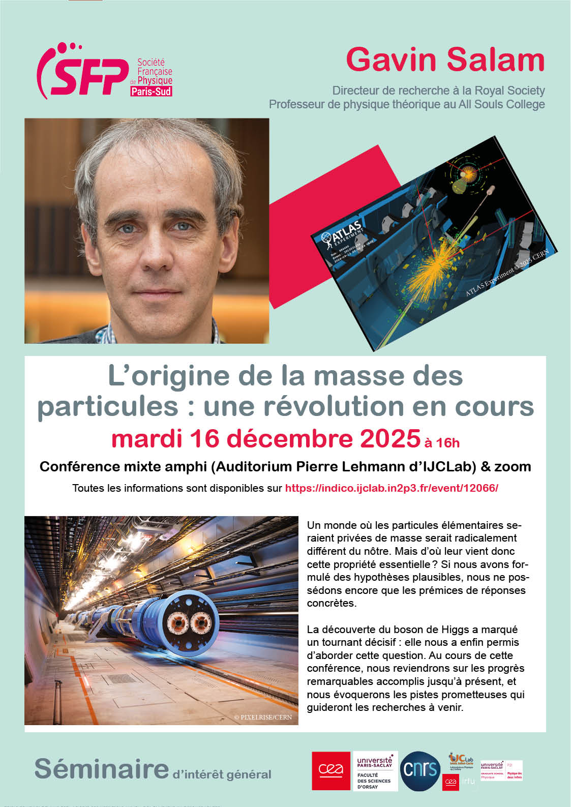 La conférence de Gavin Salam "L’origine de la masse des particules : une révolution en cours" aura lieu le mardi 16 décembre 2025 à 16h à l'Auditorium Pierre Lehmann au bâtiment 200 du laboratoire IJCLab, sur le campus de l'Université Paris-Saclay. La conférence sera également accessible en ligne via Zoom.