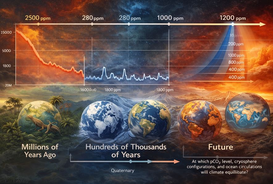 IPCC AR6 scenarios project atmospheric CO₂ concentrations of 400–1200 ppm by 2100. Understanding climates under such high pCO₂ levels requires looking beyond the Quaternary, since the past million years were dominated by glacial–interglacial cycles with CO₂ varying only between 180 and 280 ppm. Warmer periods earlier in the Cenozoic therefore offer essential analogues for studying climate dynamics, model–data mismatches, and interactions within the climate system under elevated CO₂.