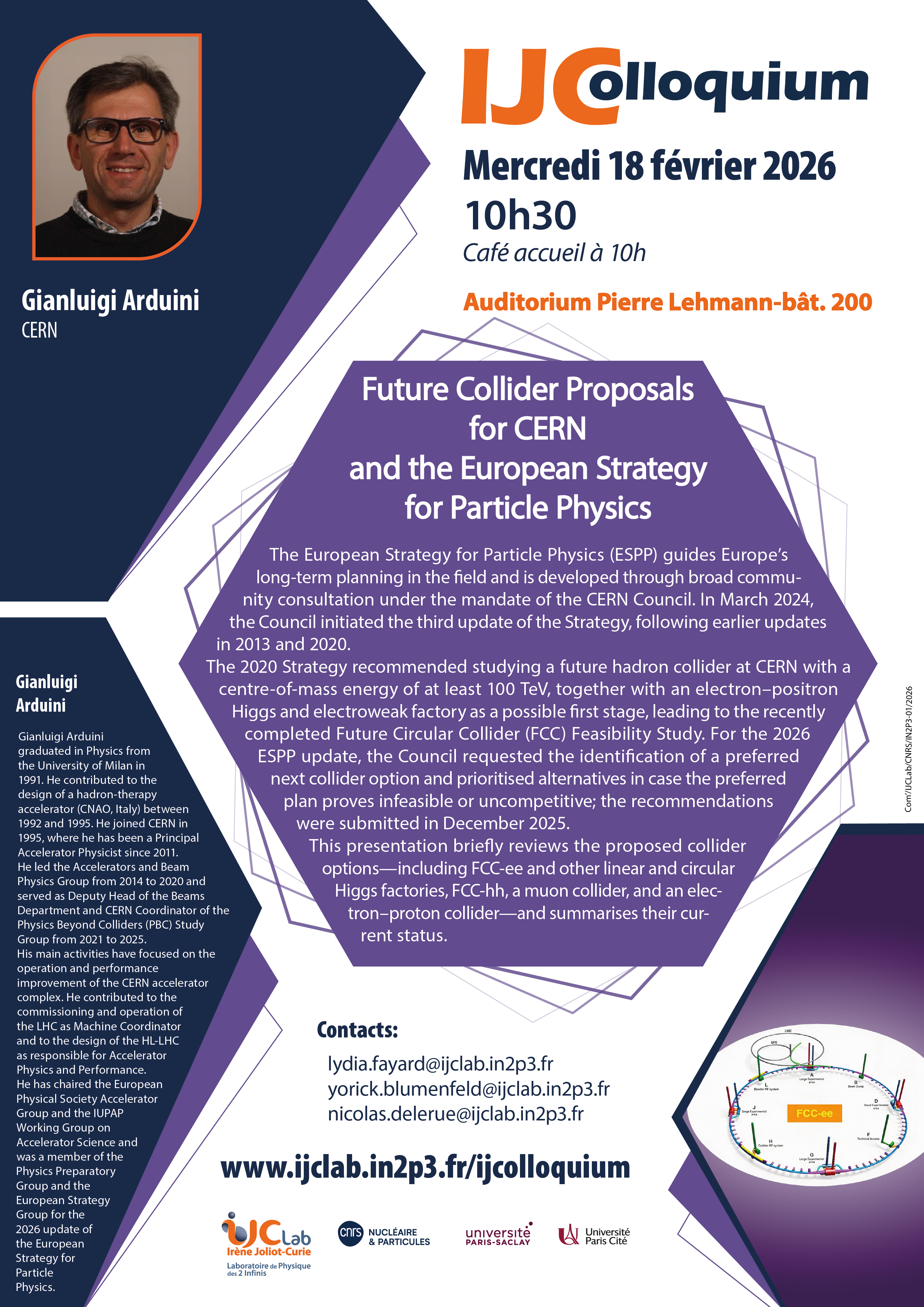 G.Arduini sera disponible le mardi 17 février après-midi pour s’entretenir avec les personnels du laboratoire. Si vous souhaitez un rendez-vous (individuellement ou en petit groupe), veuillez contacter Nicolas Delerue nicolas.delerue@ijclab.in2p3.fr qui est le membre du Comité Colloquium chargé d’établir son planning.
