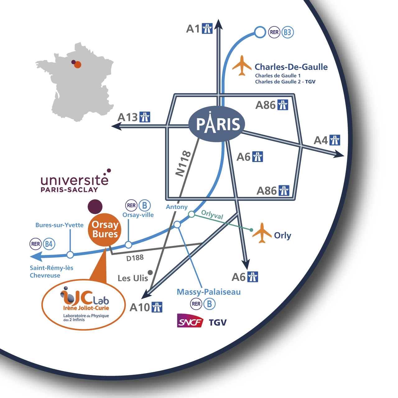IJCLab is located on the Université d’Orsay Paris-Sud Campus, 25 kilometers south-west of Paris. The easiest way to reach the Orsay campus is by taking the RER B line to the Orsay-Ville station (direction St-Rémy-les-Chevreuses)